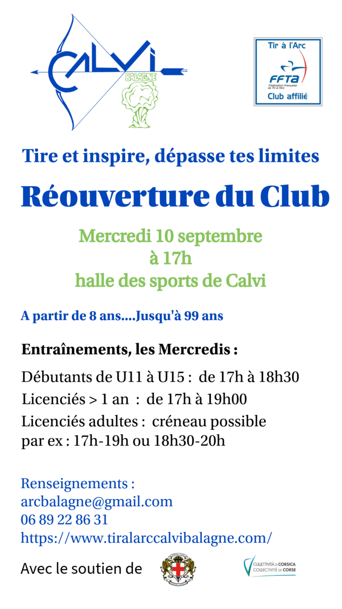 La Réouverture du Club se fera le Mercredi 10 septembre 2025 à 17H au Gymnase de Calvi.